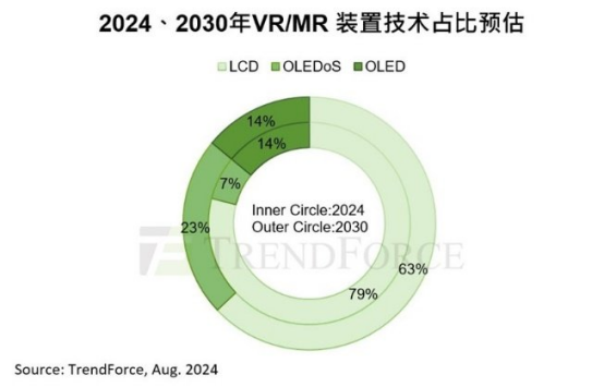 In the OLED production process, the luminescent material after evaporation cannot completely cover the display screen, which easily deepens the "screen window effect" when the VR/MR device is used. TrendForce said that OLED technology is not as competitive as OLEDoS in the high-end market, and its cost-effectiveness cannot match that of LCD products. In addition, OLED applications in the VR/MR market mostly rely on specific manufacturers, and its penetration rate has been limited for a long time. TrendForce estimates that between 2024 and 2030, the technology share of OLED in the VR/MR market will remain at 13% to 15%.